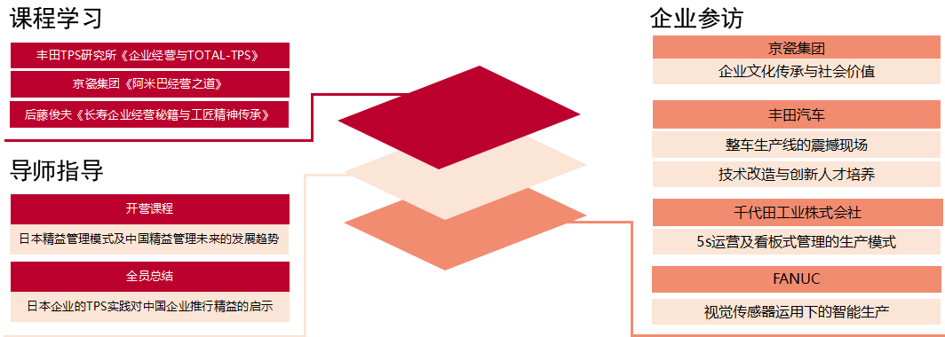 此行,日本商务考察研修班,我们将学习原汁原味的精益管理思想,走进阿米巴经营理念的摇篮京瓷集团、品质享誉全球的汽车生产标杆丰田汽车、丰田、本田等品牌的零部件供应商千代田工业株式会社、数控系统生产厂商发那科,聆听丰田研究所的精益课程以及后藤俊夫先生的名师课堂,提升企业管理者对精益的理解与管理的认识、,推动TPS转化为CPS(中国生产方式,China Production System),实现以优品质、低成本和升效率响应市场需求。