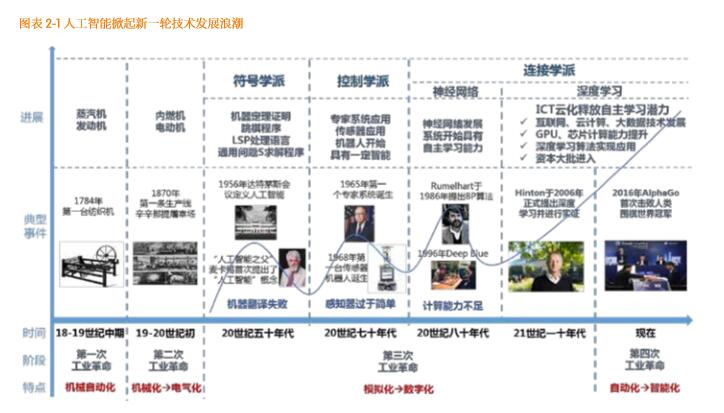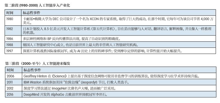 同时本部蓝皮书对目前人工智能领域涵盖的产业与技术发展环境、全球其余情况和产业化应用等方面进行了分析和阐述,将人工智能发展分为三个阶段,第一阶段(1956-1980)人工智能诞生;第二阶段(1980-2000)人工智能步入产业化;第三阶段(2000-至今)人工智能迎来爆发。