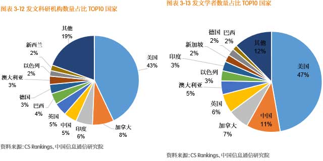 美国人工智能技术水平稳居全球前列,人工智能研究机构数量和学者数量在全球占比接近半数。中国科研机构数量与英国和印度相当,学者数量与美国存在差距,但是明显高于其他国家,近几年呈现增长趋势。