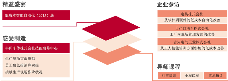 为了能确保本次日本LCIA低成本智能自动化深度研修商务考察的学习质量,除了参加2019日本LCIA低成本智能自动化展览外,翔正国际日本LCIA低成本智能自动化深度研修班的学员们,将走进展会中的知名企业——世界汽车系统零部件供应商的日本电装株式会会社工厂、丰田员工技能培训中心的丰田车体株式会社技能研修中心,和日本第二大汽车公司的日产汽车横滨工厂及股和电气工业株式会会社工厂等,亲临日本500强企业工厂生产第一线,通过生产线参观、道场实践、导师课程、企业高层接待讲解等环节近距离、全方位、互动式学习日本低成本智能自动化的成功经验,领略日本低成本智能自动化的奥秘所在。