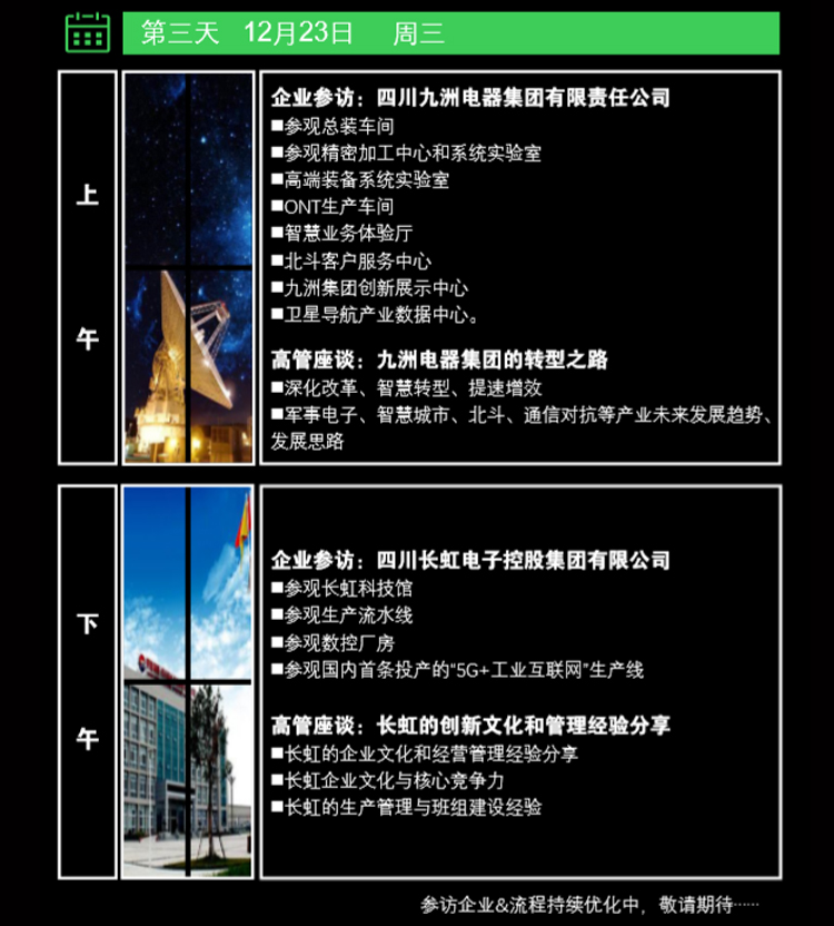 本次学习特邀中国航空工业信息中心原首席顾问宁振波教授带队,深入考察南钢集团、中电科十四所、澄西造船厂、一汽锡柴、江苏大明,通过工厂实地考察、专家讲解及交流研讨相结合的方式,深度探寻企业数字化和智能化转型之道传统工业制造业江河日下,德阳这座“重装之都”却焕发出新的活力,成百上千装备制造企业已走上转型发展之路,从“重装之都”十年转身为“智造之城”。它的姊妹城市——绵阳,也不谋而合地迈上了这条波澜壮阔的转型之道,从老军工基地到“西部硅谷”,短短十年,一跃成为中国唯一的国家科技城。这两座城市及众多企业成功转型的背后,蕴藏着怎样的“玄机”?。